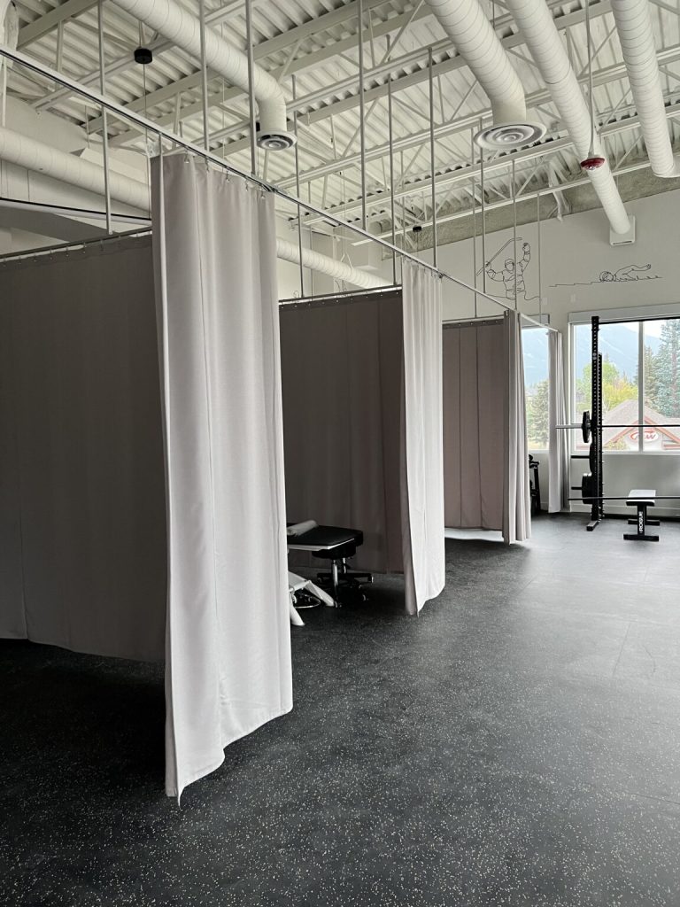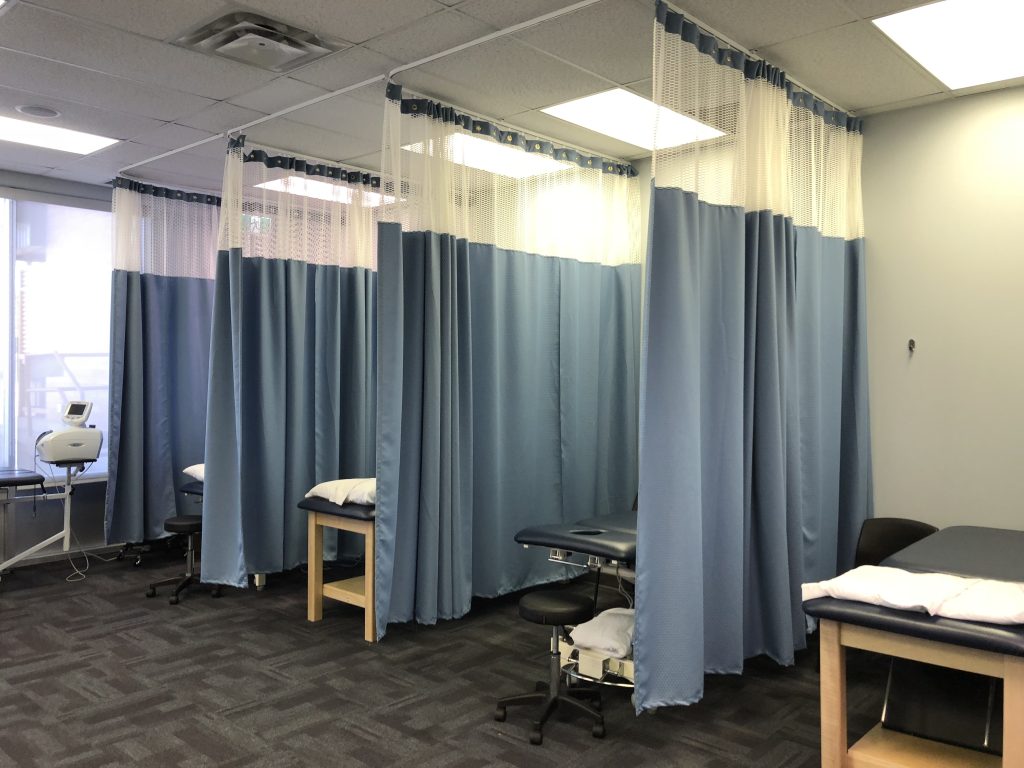 Suspended cubicle tracks with mesh top curtains to maximize lighting throughout the space. Mesh top also required for fire regulations
